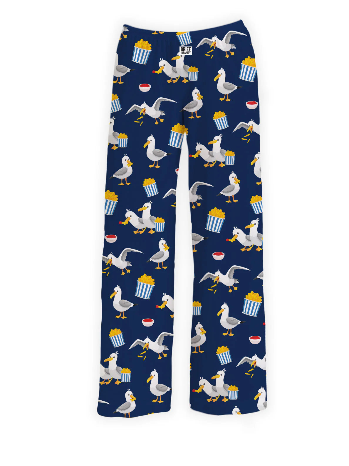 Brief Insanity Channel the chaos of the boardwalk with these Seagull French Fry Lounge Pants! Adorned with seagulls cheekily snatching fries, this unique print adds fun flair to your loungewear lineup. Whether you're lounging at home or grabbing a casual snack, these pants keep you comfy with their soft fabric and comfortable fit.